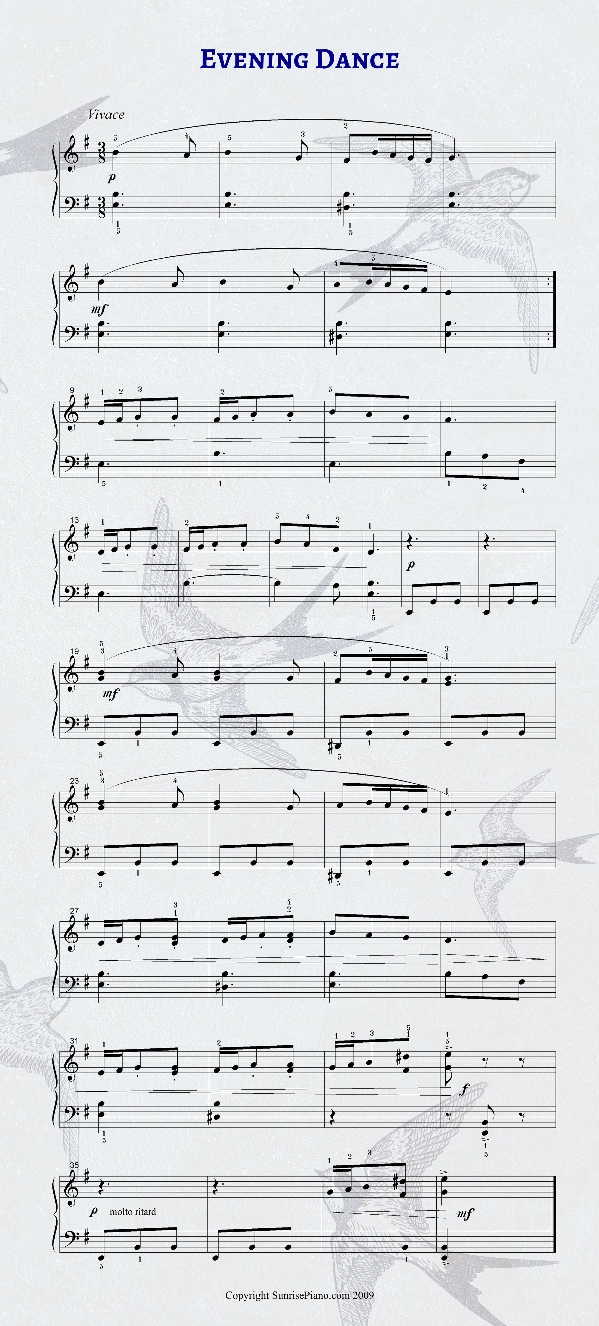 This fast piece, marked vivace, is in the Key of E Minor. Written in 3/8 time, it uses sixteenth and eighth note patterns for a lively dance rhythm.
