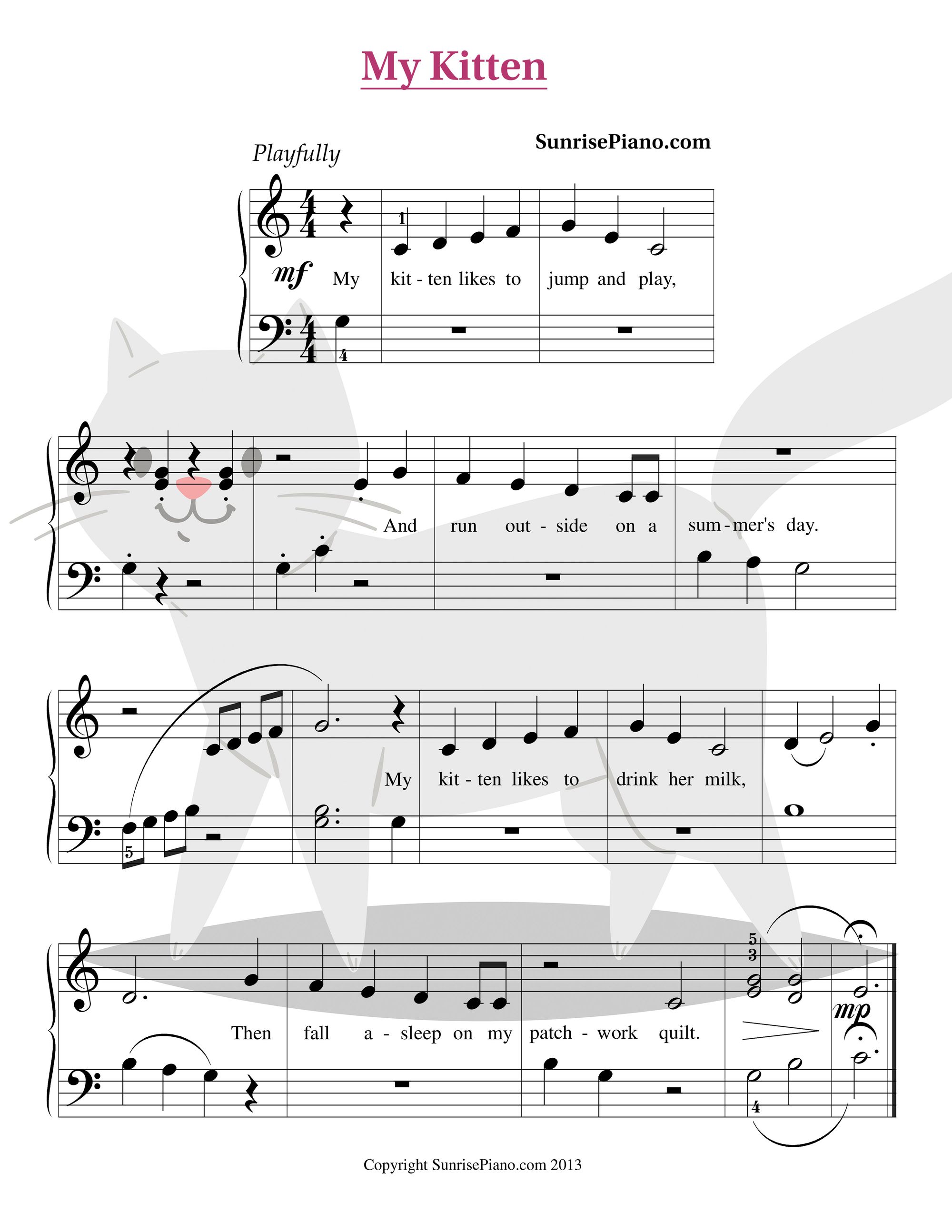 This playful piece for a beginning student is in middle C hand position. It has some staccato and legato markings to show when the kitten is jumping, running, and falling asleep.