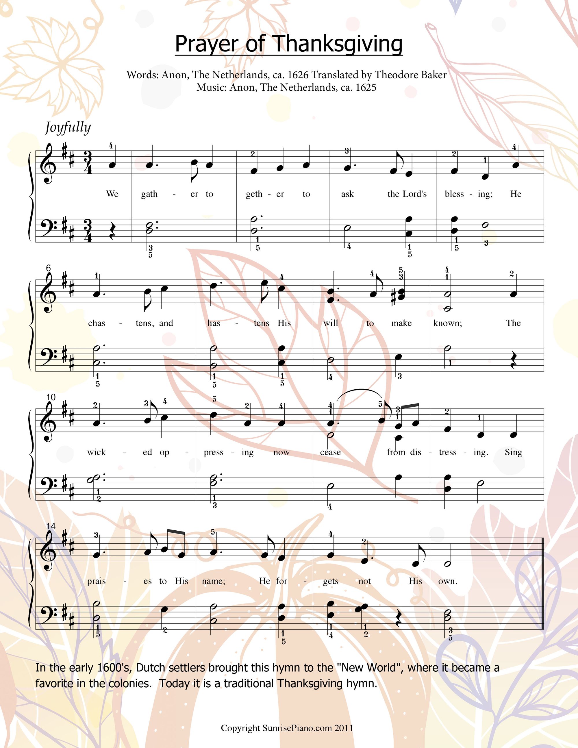 This hymn was brought to the "New World" in the early 1600's. It soon became a favorite in the American colonies. It is still sung today as a traditional Thanksgiving hymn.